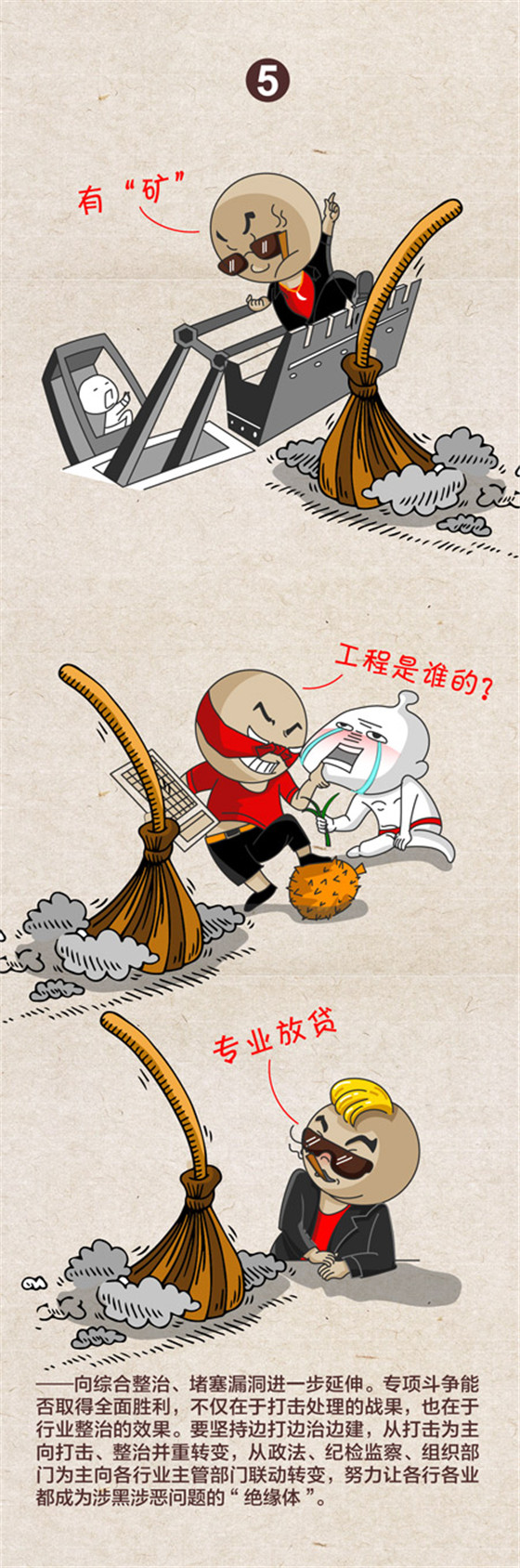 中央紀委國家監(jiān)委網站近日發(fā)布一組題為《2019掃黑除惡“六個延伸”》的漫畫,對2019年掃黑除惡專項斗爭提出向偵破大案、打財斷血進一步延伸,向網絡空間、新興領域進一步延伸,向深挖幕后、打傘破網進一步延伸,向依法懲治、快訴快判進一步延伸,向綜合整治、堵塞漏洞進一步延伸,向固本強基、鏟除土壤進一步延伸等六大方向。
