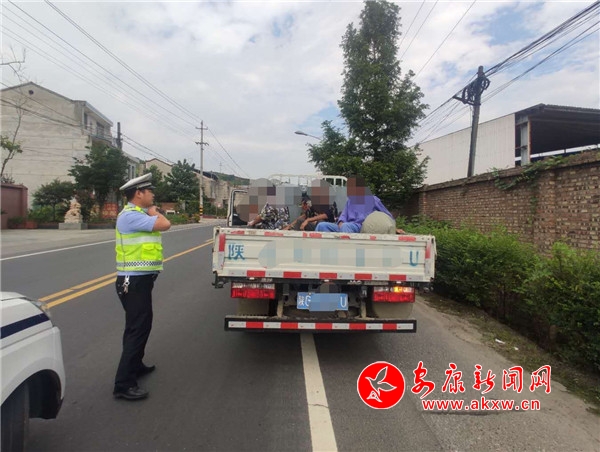 7月31日15時許,大隊執(zhí)勤民警在316國道沿線開展路面巡邏,行至恒口東大門時,發(fā)現一輛號牌為皖AC***C號輕型欄板貨車后車廂有違規(guī)載人嫌疑,巡邏民警立即上前攔停,示意駕駛人李某某停車接受檢查。經查,該貨車核定載人數為5人,實際載9人,貨車車廂違法載客4人,屬于貨車違法載客的嚴重交通違法行為。