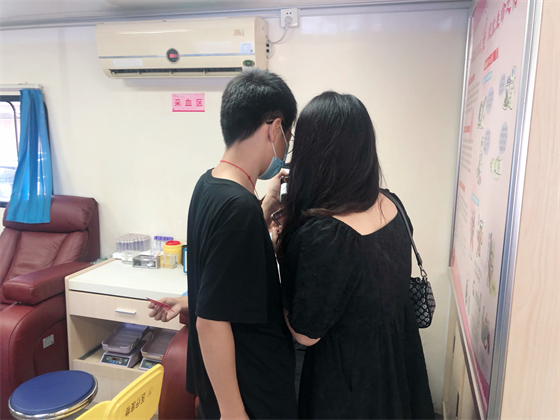 中秋節(jié)不僅街上熱鬧,獻血車上也熱鬧,鄧孟杰正坐在采血椅上獻血,他漂亮大方的女友站在旁邊跟他聊著晚上要吃什么,女友的弟弟坐在遠一點的地方玩著手機,女友的媽媽則坐在體檢桌前測量血壓,“一人獻血,三人陪同”的場景著實有點可愛,但鄧孟杰笑得十分開心,一直想獻血的他特別選了中秋這個日子,大概也是想和愛人親人一起分享這種美妙的人生體驗。鄧孟杰的女友拿起他的獻血證撒嬌到:“這次我們陪你,下次你也要陪我來獻血?!闭f完把手機塞給了一旁的弟弟,指揮他給自己和男友拍合照,一邊打趣弟弟拍照技術不好一邊把男友手里獻血證的位置調了又調。