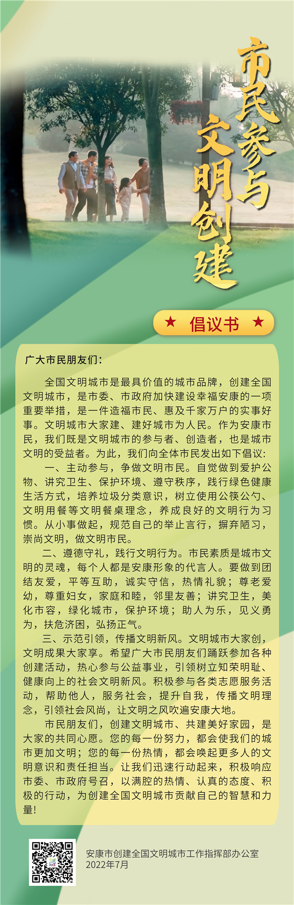 全國文明城市是最具價值的城市品牌,創(chuàng)建全國文明城市,是市委、市政府加快建設(shè)幸福安康的一項重要舉措,是一件造福市民、惠及千家萬戶的實事好事。文明城市大家建、建好城市為人民。作為安康市民,我們既是文明城市的參與者、創(chuàng)造者,也是城市文明的受益者。為此,我們向全體市民發(fā)出如下倡議:??