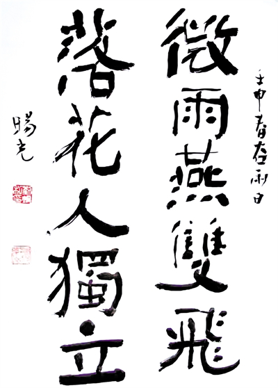 縱觀劉旸光先生的作品,其正楷筆致遒勁、骨肉停勻深諳晉唐書理;所做隸書,結體開張、筆意瀟灑、饒有“石門”的遺意;其草書氣機暢達、空靈疏朗、暗合明人意趣,而篆書則變化多端、垂腳舒展、顧盼自然,大有周秦風韻。在騰挪跌宕的線條構筑的黑白空間,捕捉轉瞬即逝的靈感。他的作品意在筆先,胸有成竹,中側鋒并用信手揮灑,一氣呵成,筆墨酣暢、淋漓盡致,如入無人之境,觀賞先生作書簡直是超然于物外的享受。