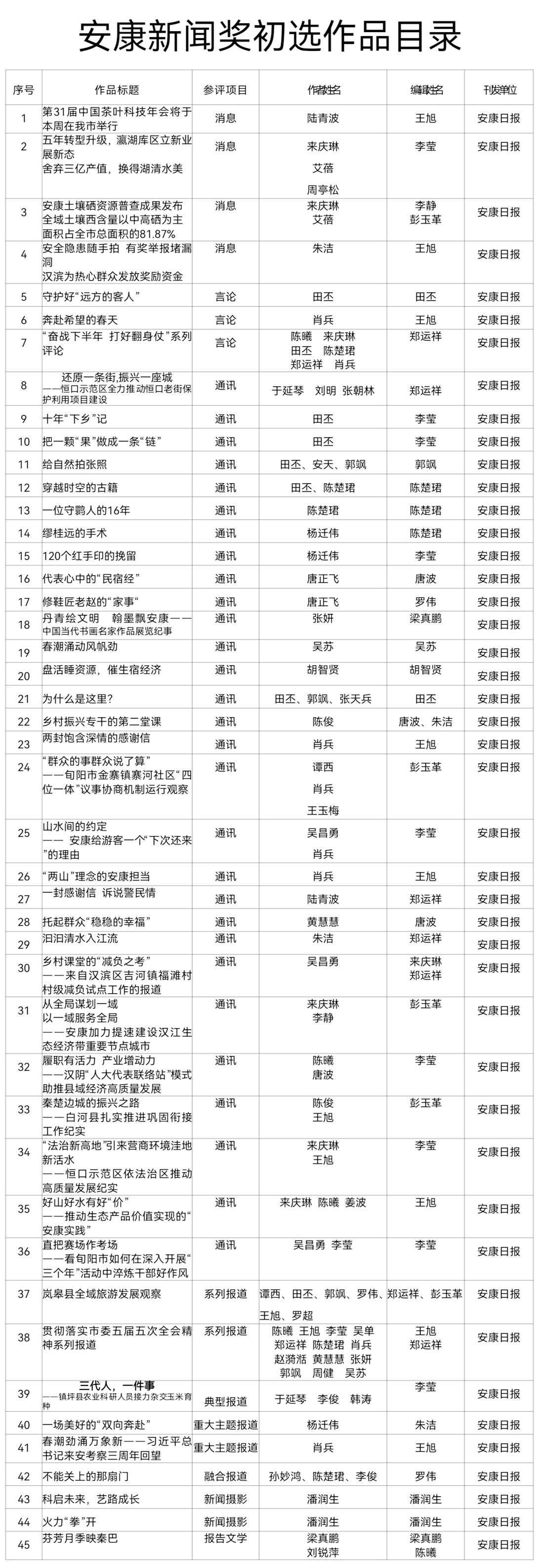 經(jīng)過3月20日編委會推薦、社黨委研究決定,擬推薦以下45件新聞作品參評2023年度“安康新聞獎”。公示時間從2024年3月21日至2024年3月27日,公示期5個工作日。如有不同意見,請向安康日報社機關(guān)紀委、新聞管理部反映。