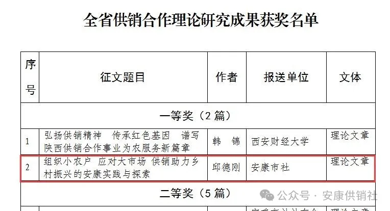 按:本文系安康市供銷合作社黨組書記、理事會主任邱德剛署名理論文章,立足供銷助力鄉(xiāng)村振興的安康實(shí)踐與探索,深入闡述了“組織小農(nóng)戶應(yīng)對大市場”的內(nèi)在邏輯,把群眾“組織起來”投身經(jīng)濟(jì)合作的實(shí)踐方法,在助力鄉(xiāng)村振興、推進(jìn)共同富裕實(shí)踐中探索出一條可復(fù)制可推廣的典型經(jīng)驗(yàn),其理論內(nèi)涵、實(shí)踐邏輯為在推進(jìn)鄉(xiāng)村振興中更好發(fā)揮供銷社的獨(dú)特優(yōu)勢和重要作用提供了有益參考,具有較強(qiáng)的指導(dǎo)意義。該文在中華全國供銷總社和陜西省供銷總社“薪火相傳七十載,砥礪奮進(jìn)新時(shí)代”主題征文中獲評“全省供銷合作理論研究成果一等獎(jiǎng)”。