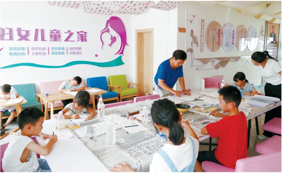 與此同時,在聯(lián)合子中心的書法教室,數(shù)名兒童端端正正地坐在書桌前練習書法?!爸笇嵳铺摗⒇Q掌平腕、心正則筆正……”聯(lián)合子中心管理員彭長明在一旁給孩子們指導。