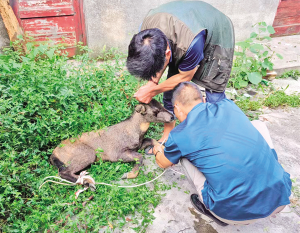 有著多次救助野生動物經(jīng)驗的八仙保護站站長鄒奎兵,一邊安撫驚恐不安的野羊,一邊聯(lián)系當(dāng)?shù)孬F醫(yī)準(zhǔn)備救治。針劑急救,傷口處理,很快就緒,并臨時安置在千家坪林場廢棄的場院中。