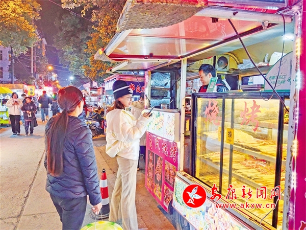 暮色起,華燈上。位于縣城河街美食、建設路夜市步行街里人潮涌動,商家的吆喝聲、食客的談笑聲……融匯成夜間的熱鬧景象。不少市民和游客在這里尋味美食,有的駐足在攤位前交談、有的在品嘗美食、有的掃碼付款,在味蕾與煙火氣的碰撞之中感受著縣城的年味。