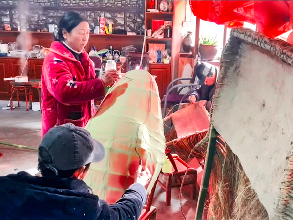 “龍頭是整條龍的重點(diǎn),刻畫要逼真,色彩還得鮮艷。忙碌了一年的鄉(xiāng)親們,就希望在正月里,抖擻精神,舞動(dòng)起來?!闭f話間,李忠寶一雙巧手上下翻飛,正在修剪龍頭花燈的胡須,忙得額頭沁出了汗珠。兒子李石磊則忙著幫烤、粘、填、糊、上色……在他們父子倆的精雕細(xì)琢下,一個(gè)威風(fēng)凜凜、栩栩如生的花燈道具龍頭,總算扎制完成。
