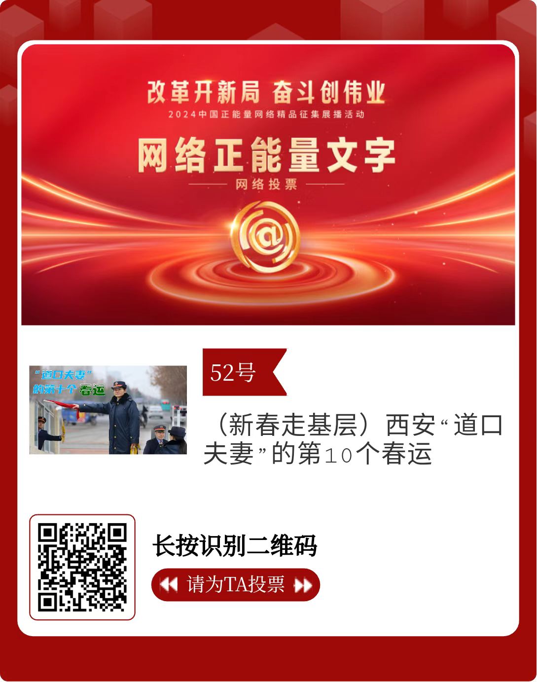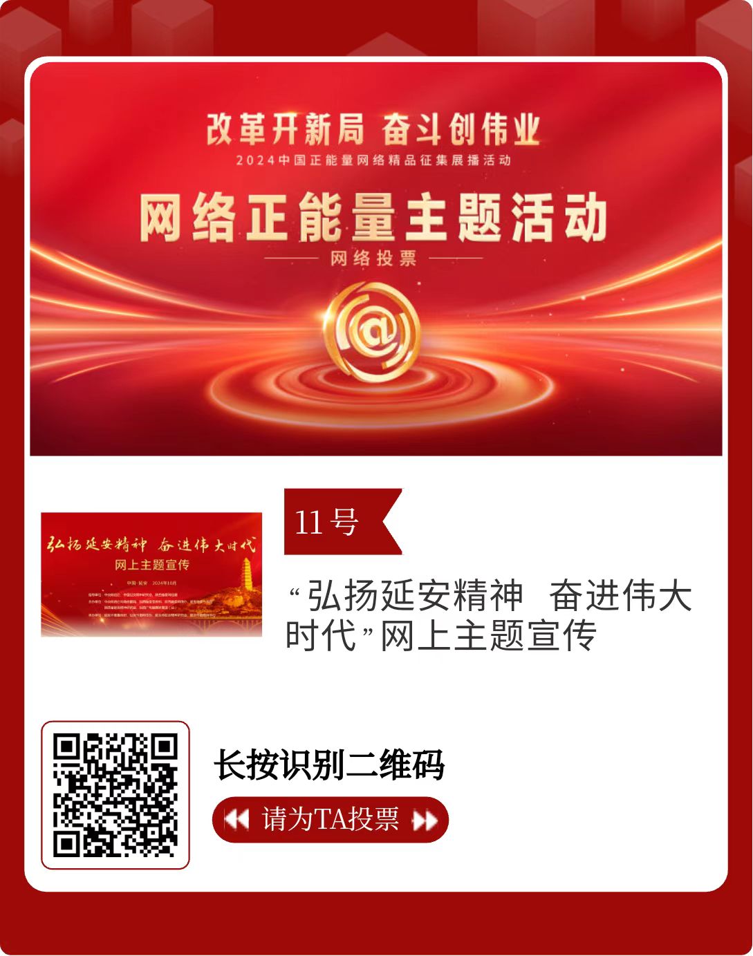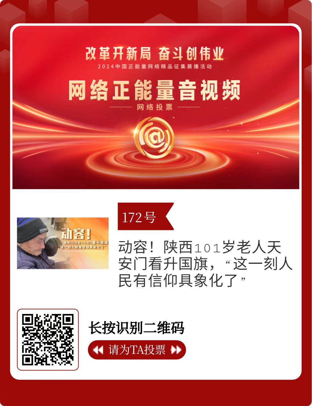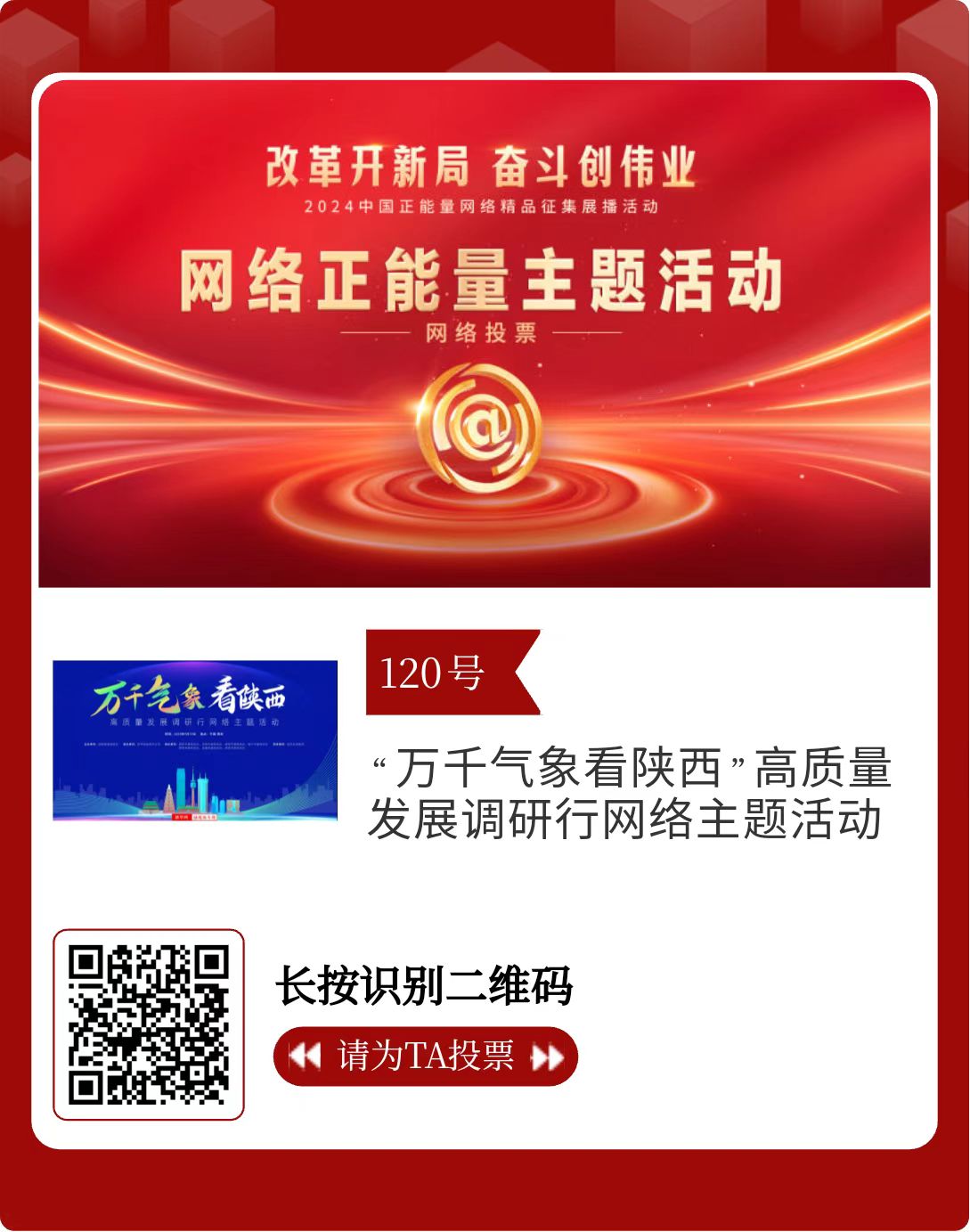 改革開(kāi)新局,奮斗創(chuàng)偉業(yè)。由中央網(wǎng)信辦主辦的2024中國(guó)正能量網(wǎng)絡(luò)精品征集展播活動(dòng)今天啟動(dòng)網(wǎng)絡(luò)展播投票。