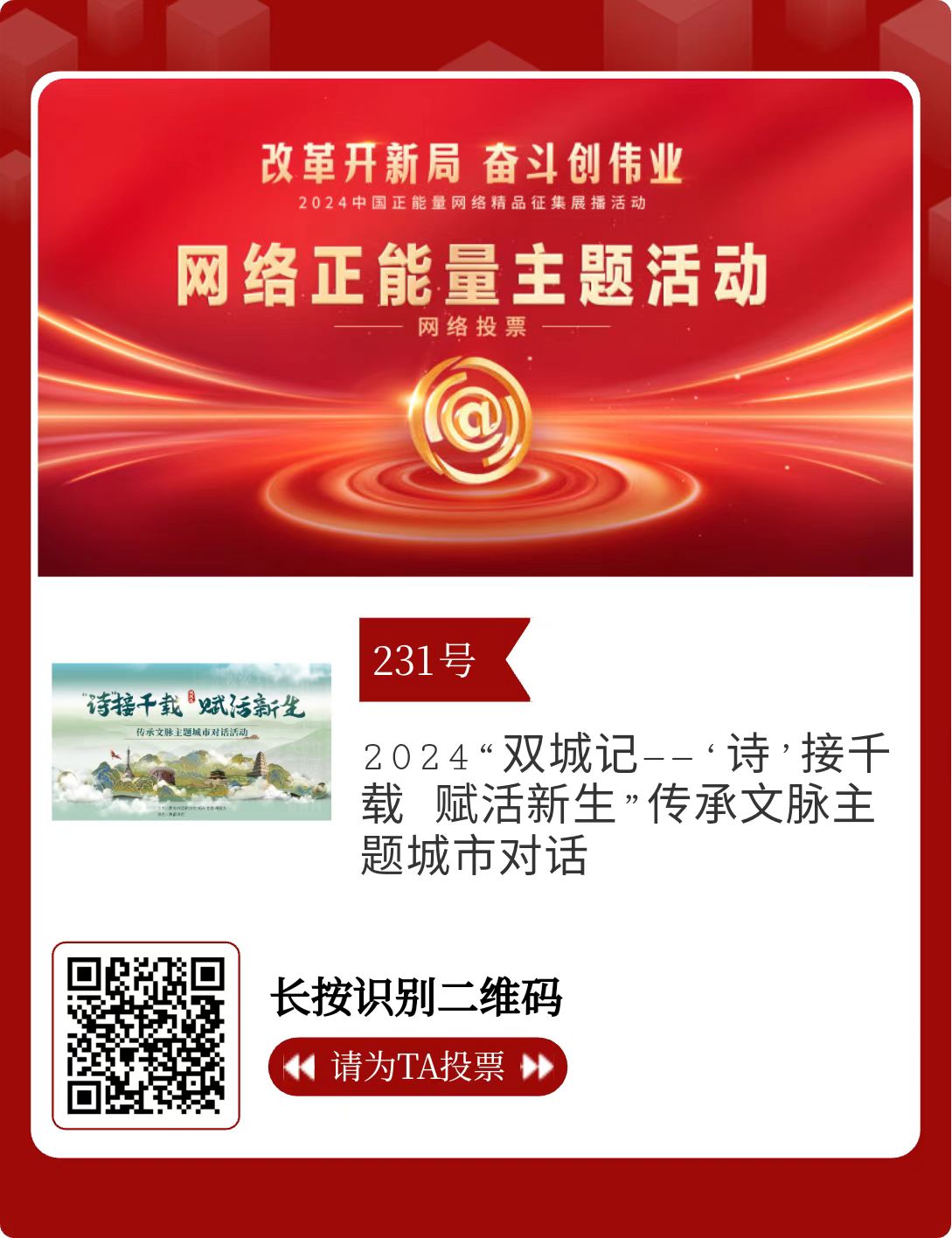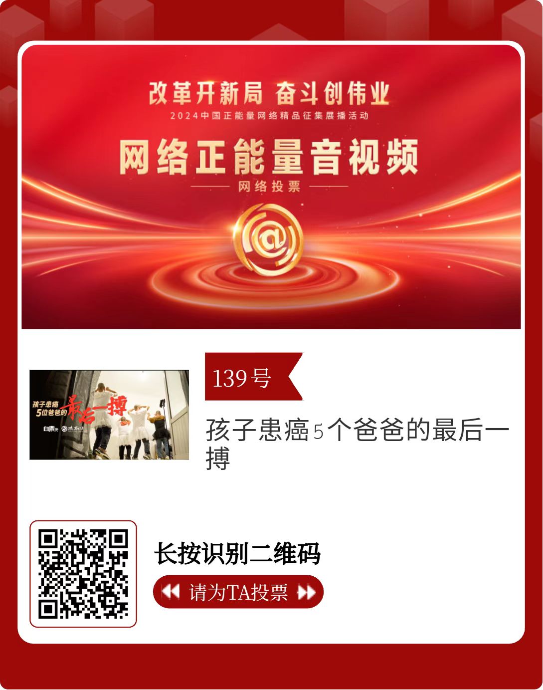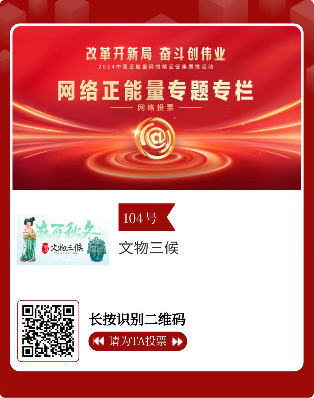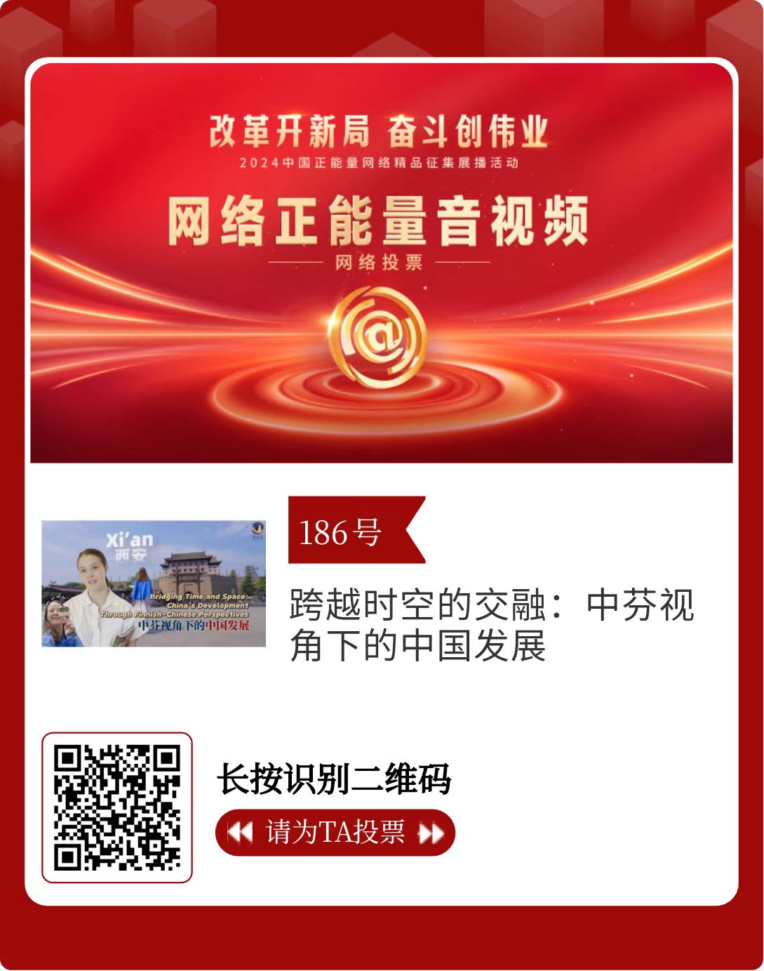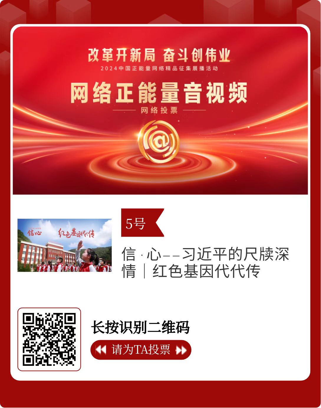 改革開(kāi)新局,奮斗創(chuàng)偉業(yè)。由中央網(wǎng)信辦主辦的2024中國(guó)正能量網(wǎng)絡(luò)精品征集展播活動(dòng)今天啟動(dòng)網(wǎng)絡(luò)展播投票。
