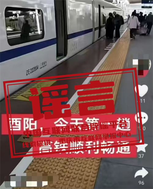 真相:近日,某網(wǎng)民在互聯(lián)網(wǎng)平臺發(fā)布信息稱“酉陽,今天第一趟高鐵順利暢通”,引發(fā)關(guān)注。經(jīng)核實(shí),網(wǎng)傳信息系謠言,酉陽縣暫未建成高鐵站。根據(jù)建設(shè)計(jì)劃,黔吉高鐵重慶段將于年內(nèi)開工建設(shè),線路貫穿黔江區(qū)、酉陽縣、秀山縣三地,線路全長約224.2km,全線設(shè)置車站3座,整個建設(shè)工期大概5年左右,預(yù)計(jì)在2030年之前全面建成通車。目前,警方已對造謠者展開調(diào)查。(來源:“重慶辟謠”微信公眾號)