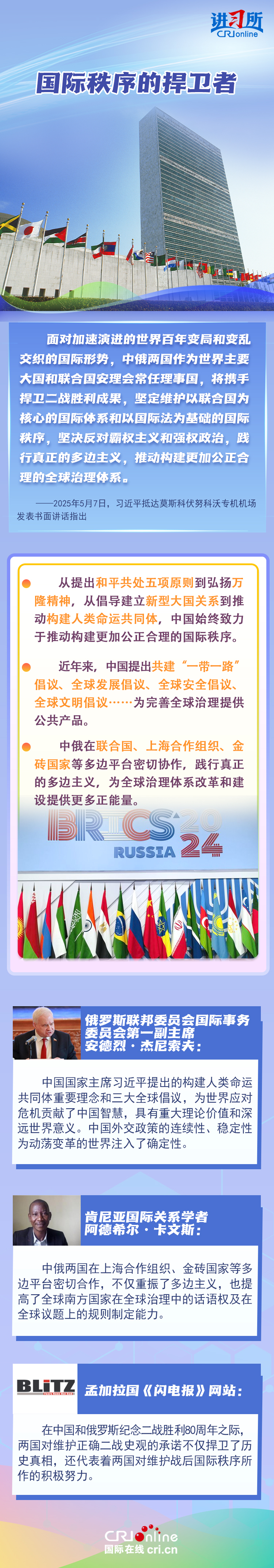 “兩國人民用鮮血和生命凝結(jié)的深厚情誼,如黃河之水奔騰不息,似伏爾加河寬廣深沉,成為中俄世代友好的不竭源泉?!苯衲晔侵袊嗣窨谷諔?zhàn)爭、蘇聯(lián)偉大衛(wèi)國戰(zhàn)爭暨世界反法西斯戰(zhàn)爭勝利80周年,也是聯(lián)合國成立80周年。在這一重要歷史時間節(jié)點,習(xí)近平主席此訪不僅為中俄關(guān)系發(fā)展注入強(qiáng)勁動力,也向世界宣示中俄兩國攜手捍衛(wèi)二戰(zhàn)勝利成果的堅定意志。