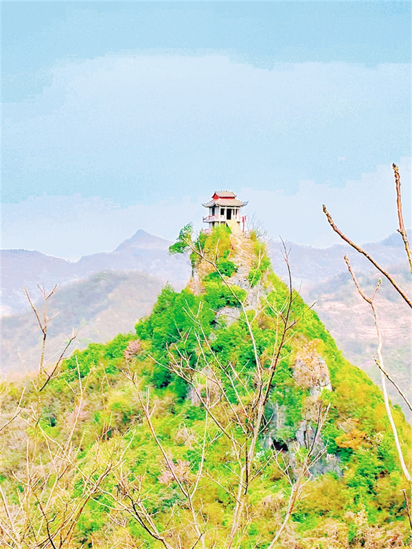 爬到山頂上,只見(jiàn)崖邊立著一塊黃龍玉色的磐石,上面鑿刻著三個(gè)紅色大字:“二鳳山”,筆鋒遒勁如刀劈斧削。白河朋友告訴我,腳下站著的是“二鳳(峰)”,對(duì)面能看見(jiàn)飛檐翹角的山峰是“一鳳(峰)”。