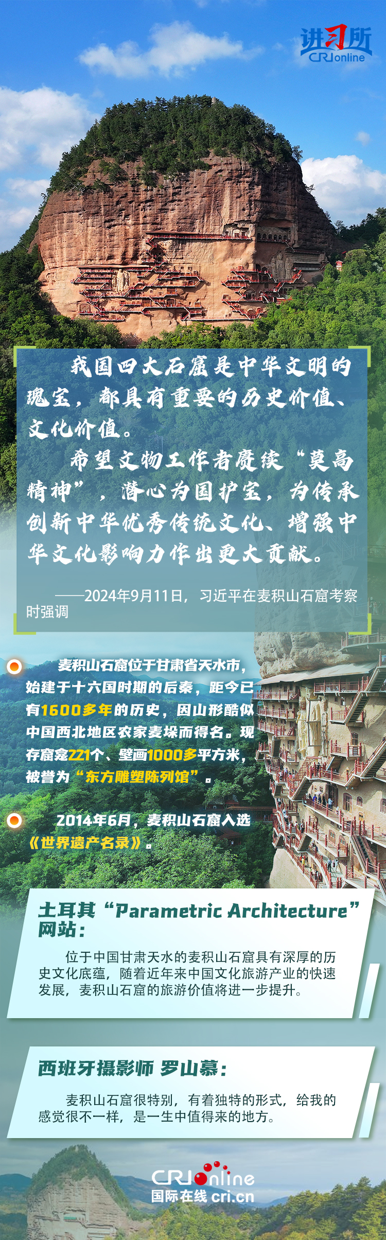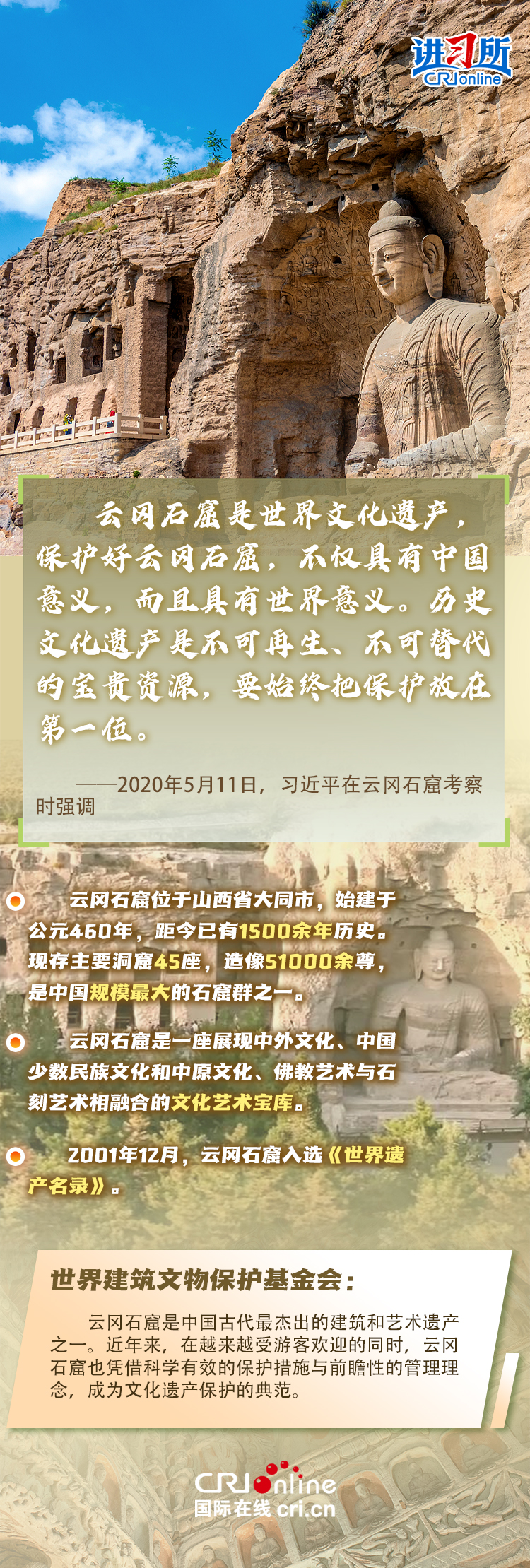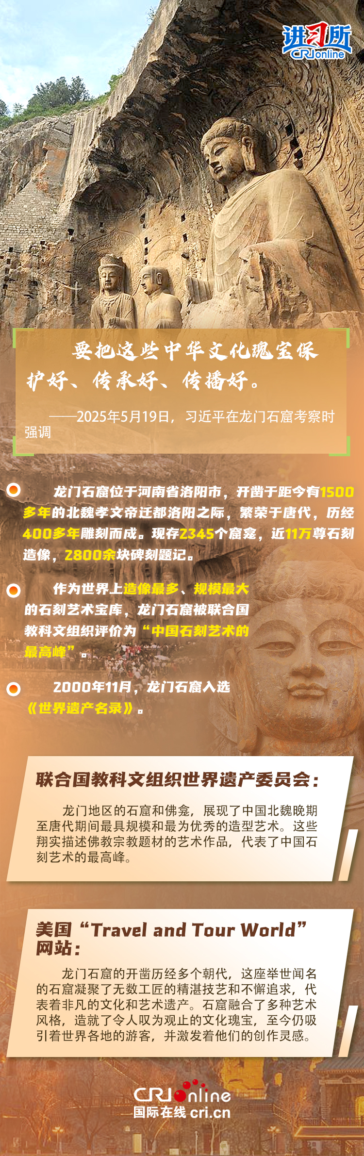 龍門石窟被聯(lián)合國教科文組織評價為“中國石刻藝術(shù)的最高峰”,與敦煌莫高窟、云岡石窟、麥積山石窟并稱為“中國四大石窟”,具有重要歷史價值、文化價值。近年來,習近平先后考察了中國四大石窟。對這些承載著中華民族文化基因和血脈的文物和文化遺產(chǎn),習近平強調(diào),“保護好、傳承好歷史文化遺產(chǎn)是對歷史負責、對人民負責?!?/p>