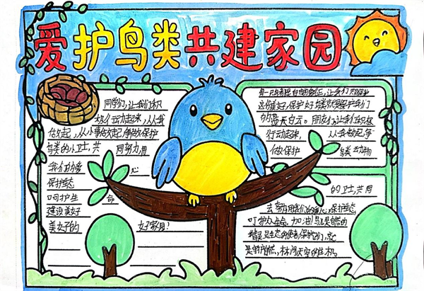 守護藍天精靈,共享美好家園!《安康高新區(qū)愛鳥護鳥倡議書》發(fā)布以來,全區(qū)的孩子們積極行動,他們用畫筆以純真之心勾勒出對鳥兒的關愛與守護。他們把對鳥兒的喜愛融進顏料,將守護的心愿畫入畫紙。稚嫩的筆觸下,有給小鳥搭建的溫暖巢穴,有禁止捕鳥的醒目標語,有鳥兒在藍天自由翱翔的愜意,有人類與鳥兒和諧共處的溫馨,有孩子們與鳥兒牽手同行的幻想…… (通訊員 劉松)