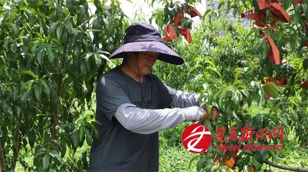 同樣迎來(lái)收獲的還有城關(guān)鎮(zhèn)的黃桃,在城關(guān)鎮(zhèn)龍嶺村的黃桃種植基地,連片的桃樹(shù)郁郁蔥蔥,金燦燦的黃桃壓彎了枝條,空氣中彌漫著誘人的桃香。基地負(fù)責(zé)人劉宏正忙著采摘,臉上洋溢著燦爛的笑容,他一邊采摘一邊介紹道:“我們這個(gè)桃園有金鳳黃桃、黃金黃桃、秋彤桃和冬桃四個(gè)品種,一共有9畝多,從6月中旬到10月左右,陸續(xù)都有成熟的桃子?!?/p>