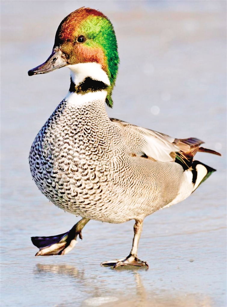 又名葭鳧、鐮刀鴨、扁頭鴨、早鴨、三鴨。雄鳥頭頂至后頸栗色,頭側(cè)及冠羽銅綠色;前頸基部有一黑色領(lǐng)環(huán),上體淺灰色,密布暗褐色波狀細(xì)紋;翼鏡綠黑色,三級(jí)飛羽延長呈鐮狀;胸黑色密布白色新月形斑,尾下覆羽絨黑色;兩側(cè)具乳黃色斑塊,腋下白色;雌鳥體羽多黑褐色而具黃褐色羽緣,形成明顯的“V”形斑;虹膜褐色,嘴黑灰色,腳暗灰色。因胸、腹、脅部密布由大漸小的黑白波紋,排列成有序的特異圖案,形似編織物而故名。