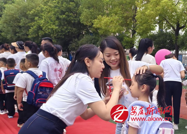 走紅毯環(huán)節(jié)將氛圍推向高潮。班主任帶領(lǐng)新生與家長(zhǎng)手牽手緩緩前行,周圍的歡呼聲此起彼伏,孩子們?cè)谶@份熱鬧中,真切感受到“成為小學(xué)生”的榮譽(yù)感?!懊6Y”環(huán)節(jié)巧思滿滿,8種寓意吉祥的物品整齊擺放,孩子們懷著好奇伸手觸摸,在指尖的互動(dòng)中,收下滿含期許的祝福。