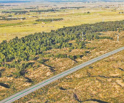 “十四五”時期,“三北”工程攻堅戰(zhàn)取得階段性成效。圖為內(nèi)蒙古庫布其沙漠北緣鎖邊林帶。新華社記者 李志鵬攝
