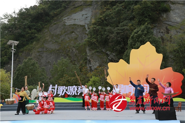 金秋時(shí)節(jié)的茨溝鎮(zhèn),萬畝紅葉、層林盡染。伴隨著歡快的鑼鼓聲,茨溝鎮(zhèn)、五里鎮(zhèn)、譚壩鎮(zhèn)三支隊(duì)伍輪番登場,不僅獻(xiàn)唱原創(chuàng)村歌,還展示特色產(chǎn)業(yè)、優(yōu)質(zhì)資源與地方文化,紛紛亮出獨(dú)具特色的“看家絕活兒”。歌伴舞《村歌飛揚(yáng)》《松壩謠》《幸福歌兒唱起來》唱出了鄉(xiāng)親們的幸福生活;以修建八一水庫為背景的安康歌謠《我來了》引發(fā)會場共鳴;民俗表演《龍的傳人》則將節(jié)目推向高潮。舞蹈、鄉(xiāng)村T臺秀、民俗表演、八岔戲等節(jié)目,或以傳統(tǒng)幽默詼諧的風(fēng)格,或以深情敘述的方式,展現(xiàn)鄉(xiāng)村新生活,為觀眾獻(xiàn)上一場別開生面的視聽盛宴,現(xiàn)場歡呼聲此起彼伏。