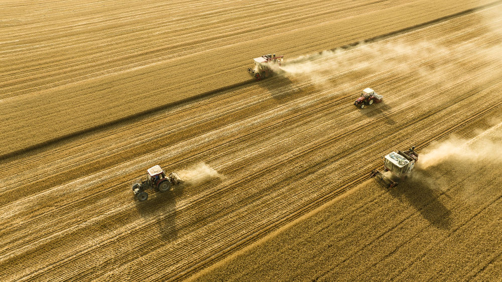 2025年6月4日,在河南省商丘市梁園區(qū)李莊鎮(zhèn)潘堂村志誠(chéng)種植農(nóng)民專(zhuān)業(yè)合作社,農(nóng)機(jī)手操作機(jī)械在農(nóng)田作業(yè)(無(wú)人機(jī)照片)。新華社發(fā)(李恒 攝)