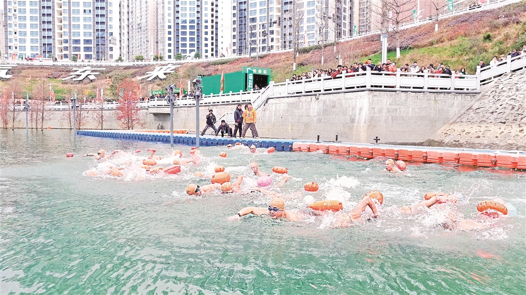 12月21日,陜西省第八屆漢江公開水域冬泳賽在紫陽縣月畔灣廣場水域舉行。當天,來自陜西、湖北、四川、重慶、河南、內蒙古自治區(qū)的44支代表隊400余名運動員報名參賽。(儲茂銀 攝)