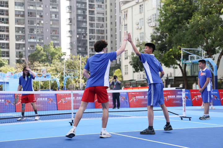4月15日,在深圳市南山外國語學(xué)校(集團)高新中學(xué),中美學(xué)生結(jié)對進行匹克球雙打比賽。新華社記者 梁旭 攝
