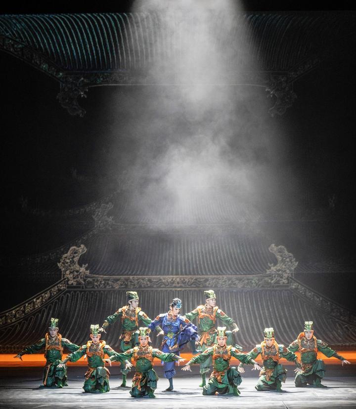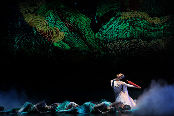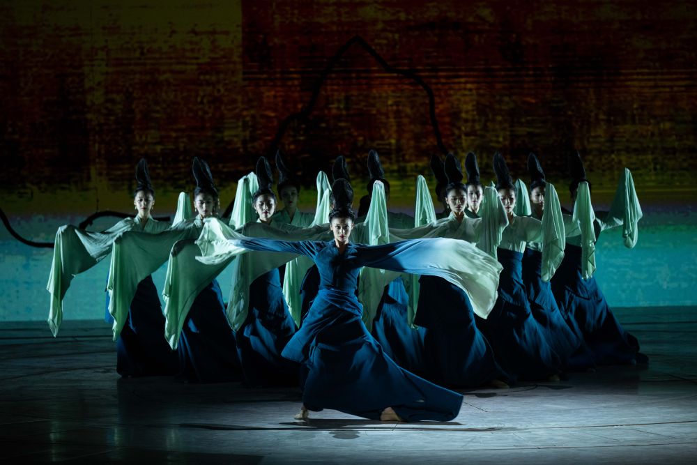 這是舞蹈詩劇《只此青綠》的演出劇照(2024年7月18日攝)?!吨淮饲嗑G》采用平行空間的敘事方式,從故宮博物院青年研究員的“展卷人”視角出發(fā),講述北宋著名畫家王希孟創(chuàng)作《千里江山圖》的故事。該劇連續(xù)3年穩(wěn)居中國舞劇票房榜首,全國巡演超800場,赴多個(gè)國家和地區(qū)演出50余場,成為傳統(tǒng)文化創(chuàng)新表達(dá)、中國藝術(shù)國際表達(dá)的典范之作。