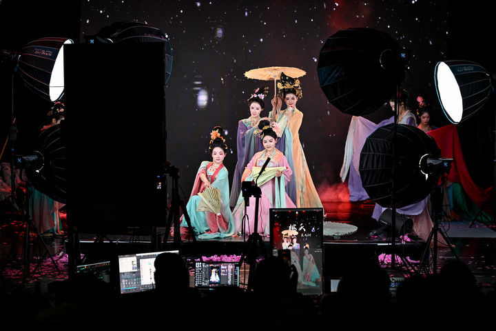 陜西省歌舞劇院的舞蹈演員在直播間進(jìn)行“團(tuán)播”表演(2025年12月25日攝)?!皥F(tuán)播”這一多人演藝直播新形式,正成為專業(yè)文藝院團(tuán)開辟線上“第二舞臺(tái)”、推動(dòng)傳統(tǒng)文化創(chuàng)新表達(dá)的新嘗試?!柏Q屏化”“快節(jié)奏”的改編,讓傳統(tǒng)劇目受到越來越多年輕人喜愛。數(shù)據(jù)顯示,陜西省歌舞劇院“團(tuán)播”單場最高曝光量超500萬,帶動(dòng)線下票房增長約10%。