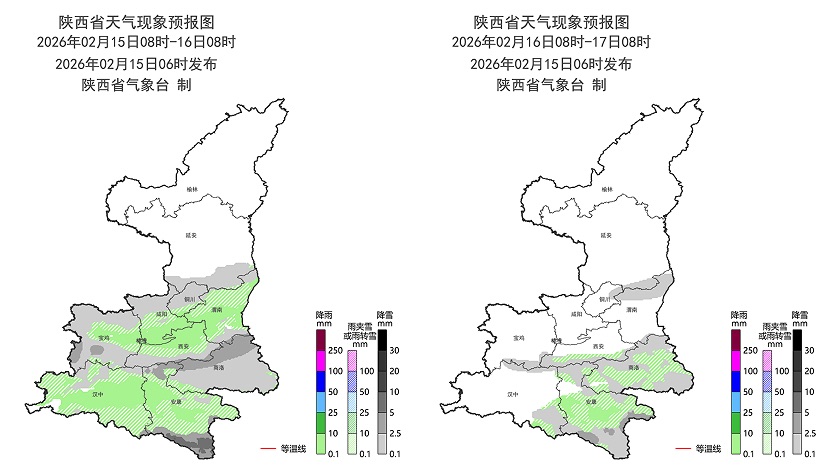 2月15日:全省陰天間多云。關中南部、陜南有小雨或雨夾雪(0~5毫米),陜南南部局地有中雨(10~15毫米);陜北南部、關中北部、秦巴山區(qū)有小到中雪或雨夾雪(0~5毫米),巴山局地有凍雨。全省大部有4級(5.5~7.9米/秒)左右偏北風,陣風可達6級(10.8~13.8米/秒)以上。日平均氣溫全省大部下降4~6℃ ,陜北北部、關中西北部局地、秦嶺山區(qū)和陜南東部下降6~8℃。夜間至清晨陜北南部、關中、陜南有輕霧,秦巴山區(qū)局地有大霧。