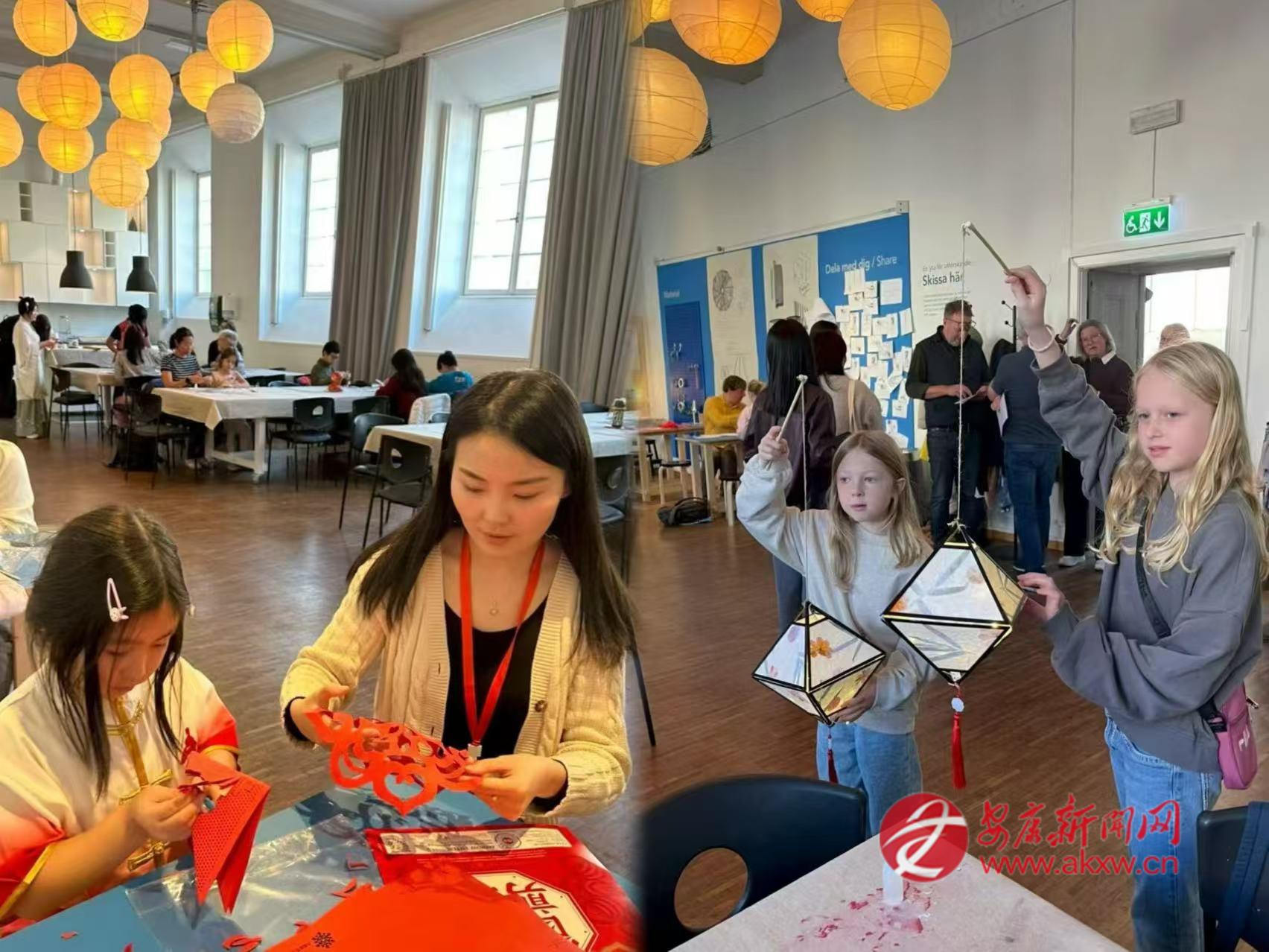 2025年中秋節(jié),在哥德堡市立博物館的展廳里,邱萌教當(dāng)?shù)睾⒆觽冏鰺艋\、剪剪紙。她和孩子們一起用宣紙折疊成燈籠,讓瑞典人得以近距離觸摸中國節(jié)日。有人好奇地問起中秋的月亮,她便講起嫦娥奔月的傳說,講起月餅的寓意,講起“千里共嬋娟”的詩句。博物館里點亮了許多盞燈籠,每一盞都映照著孩子們專注而好奇的臉龐。