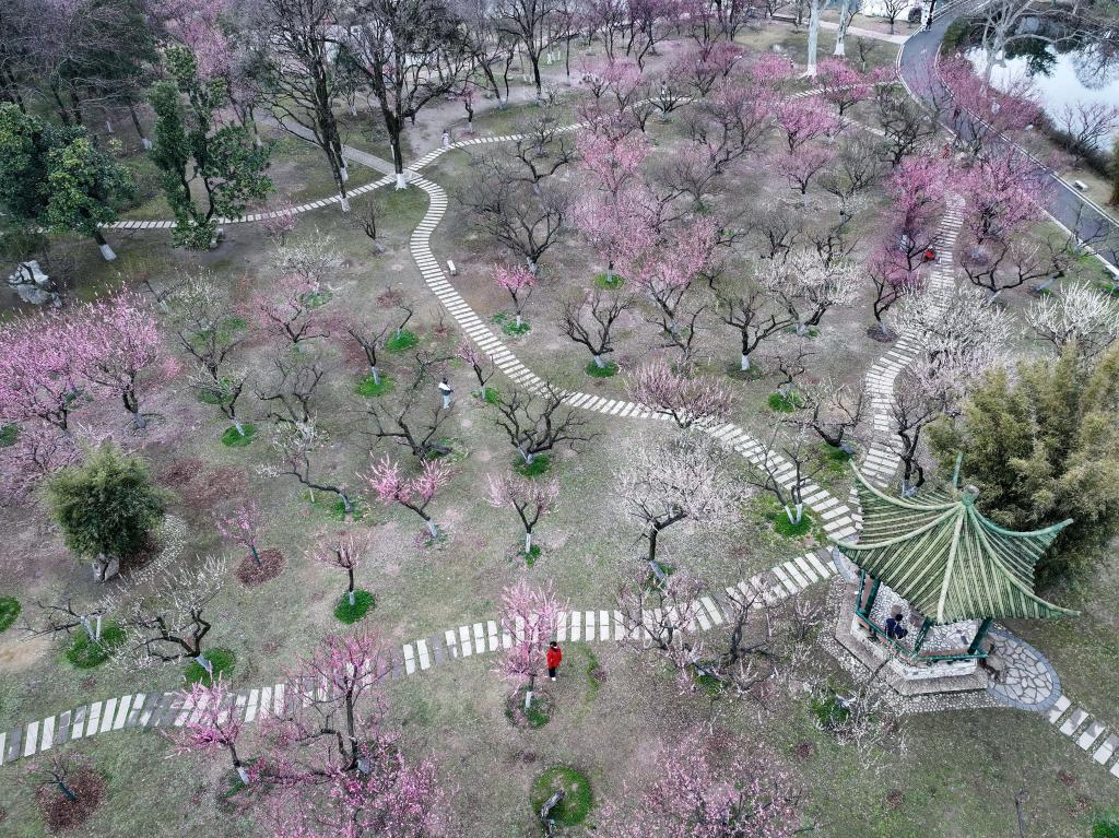 近日,游客在湖北省武漢市青山公園賞花游玩(無人機照片)。新華社發(fā)(趙軍攝)
