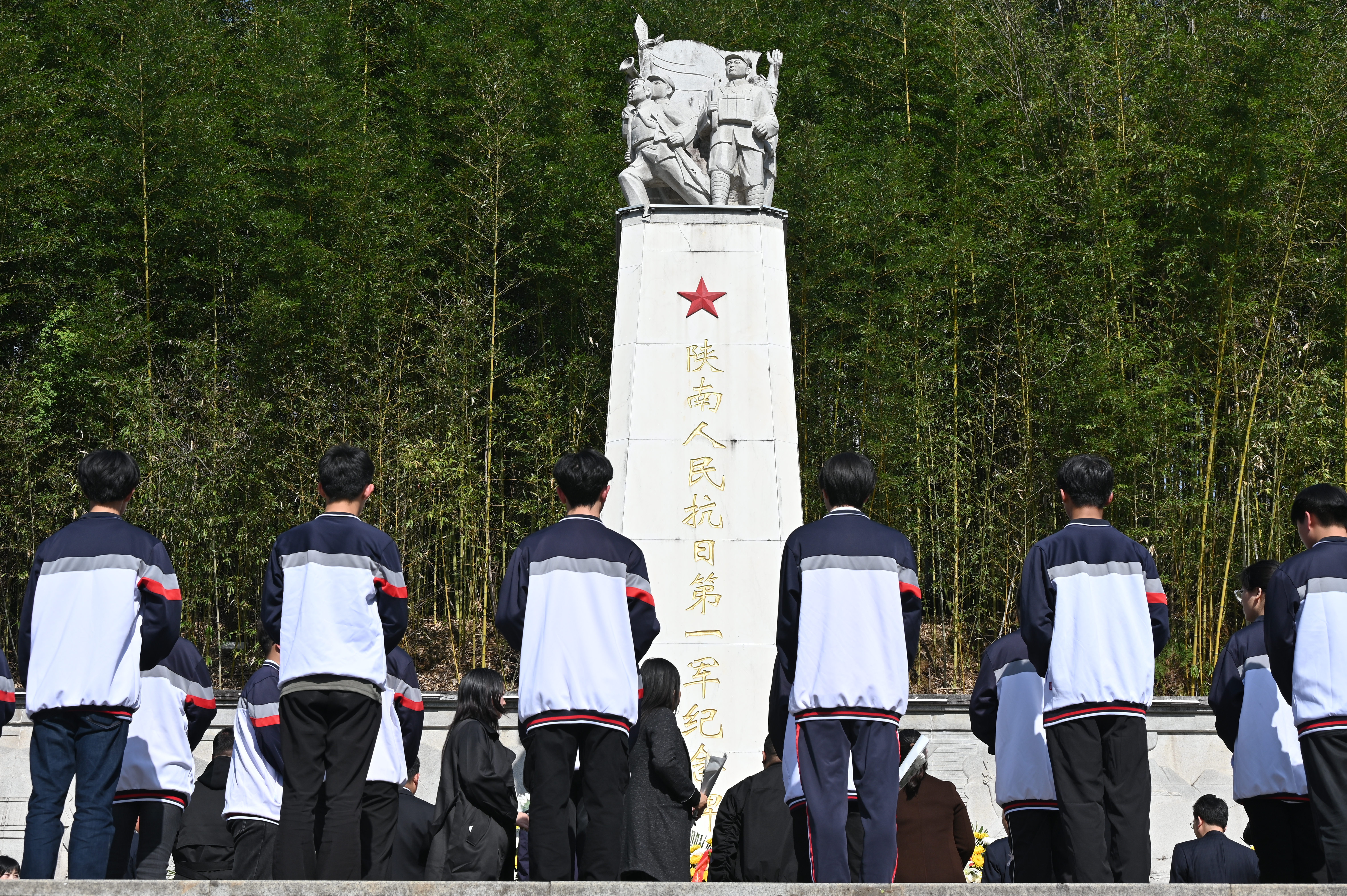 3月31日,安康職業(yè)技術(shù)學(xué)院組織師生赴漢陰縣開展“漢陰尋跡、致敬英烈”活動(dòng),參觀了漢陰縣沈啟賢將軍故居、楊棄將軍紀(jì)念館。圖為陜南人民抗日第一軍紀(jì)念廣場,師生代表敬獻(xiàn)花籃。 張智明 攝