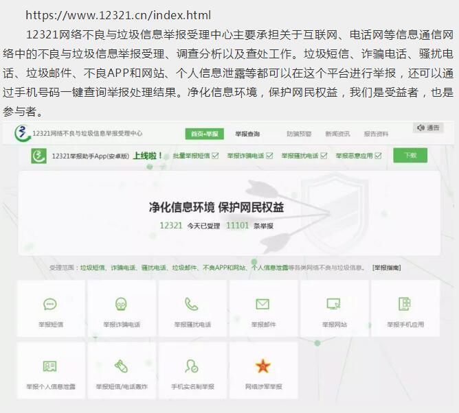 12321網(wǎng)絡不良與垃圾信息舉報受理中心主要承擔關于互聯(lián)網(wǎng)、電話網(wǎng)等信息通信網(wǎng)絡中的不良與垃圾信息舉報受理、調查分析以及查處工作。垃圾短信、詐騙電話、騷擾電話、垃圾郵件、不良APP和網(wǎng)站、個人信息泄露等都可以在這個平臺進行舉報,還可以通過手機號碼一鍵查詢舉報處理結果。凈化信息環(huán)境,保護網(wǎng)民權益,我們是受益者,也是參與者。