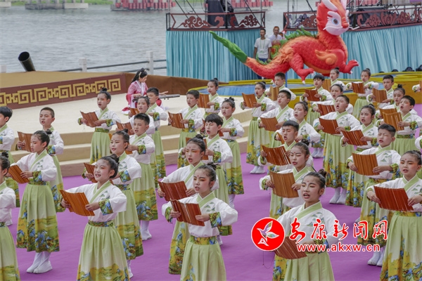 是日,遠(yuǎn)山如黛,近水碧綠,兩岸觀者如潮。“恭請(qǐng)先賢。”隨著主祭官洪亮的聲音響起,屈原雕像被緩緩護(hù)送到舞臺(tái)中央。百名童子,手持竹簡(jiǎn),齊聲詠?lái)灱牢。緊接著,身著青綠漢服女子,一列走向江邊把竹籃里面的粽子拋入江中,追念先賢,另一列繞場(chǎng)為觀眾贈(zèng)發(fā)香包,送上祝福。