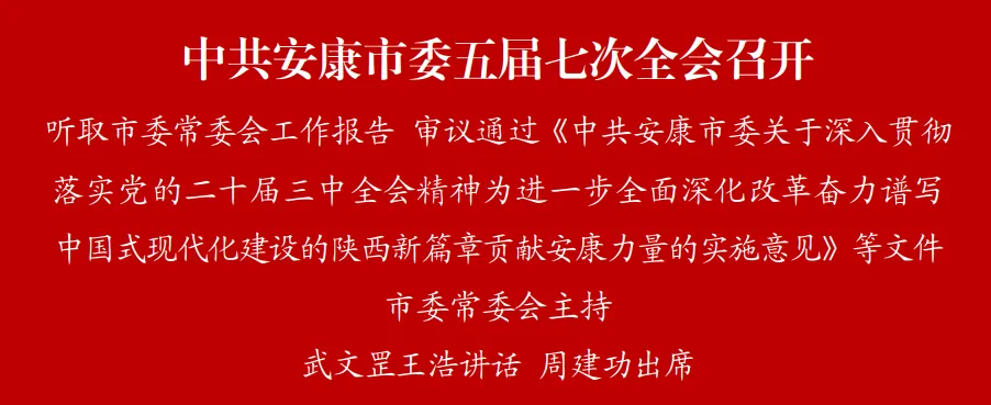 全會(huì)由市委常委會(huì)主持。市委書(shū)記武文罡講話(huà)并就《中共安康市委關(guān)于深入貫徹落實(shí)黨的二十屆三中全會(huì)精神為進(jìn)一步全面深化改革奮力譜寫(xiě)中國(guó)式現(xiàn)代化建設(shè)的陜西新篇章貢獻(xiàn)安康力量的實(shí)施意見(jiàn)》作說(shuō)明。市委副書(shū)記、市長(zhǎng)王浩部署經(jīng)濟(jì)工作。市政協(xié)主席周建功出席會(huì)議。市委常委、統(tǒng)戰(zhàn)部部長(zhǎng)、政法委書(shū)記寇全安就《中共安康市委關(guān)于在中國(guó)式現(xiàn)代化道路上建設(shè)平安祥和幸福安康的實(shí)施意見(jiàn)》作說(shuō)明,市委常委、市紀(jì)委書(shū)記、市監(jiān)委主任羅曉君就《中共安康市委關(guān)于在中國(guó)式現(xiàn)代化道路上建設(shè)風(fēng)清氣正幸福安康的實(shí)施意見(jiàn)》作說(shuō)明。