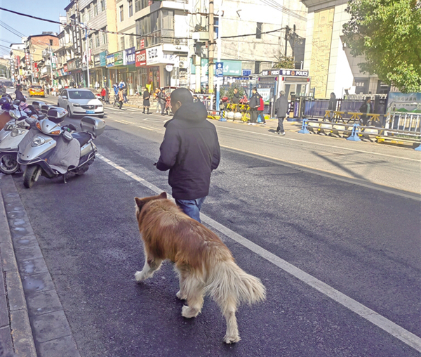 11月17日上午,筆者在漢濱區(qū)江北街道中渡路看到,有市民帶著大型犬只不牽狗繩。(高雅 攝)……
