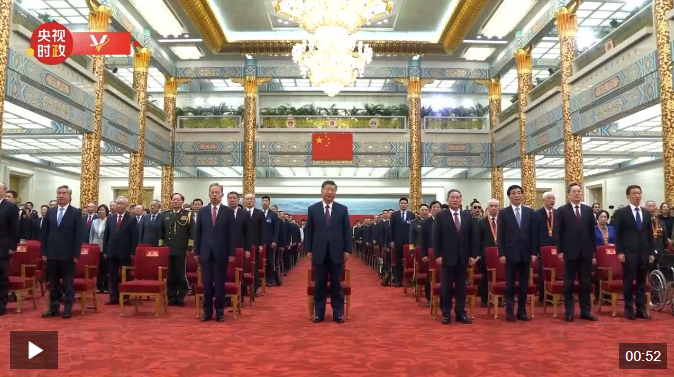 9時(shí)58分,在歡快的樂曲聲中,習(xí)近平同國家勛章和國家榮譽(yù)稱號(hào)獲得者一同步入會(huì)場,全場起立,熱烈鼓掌。