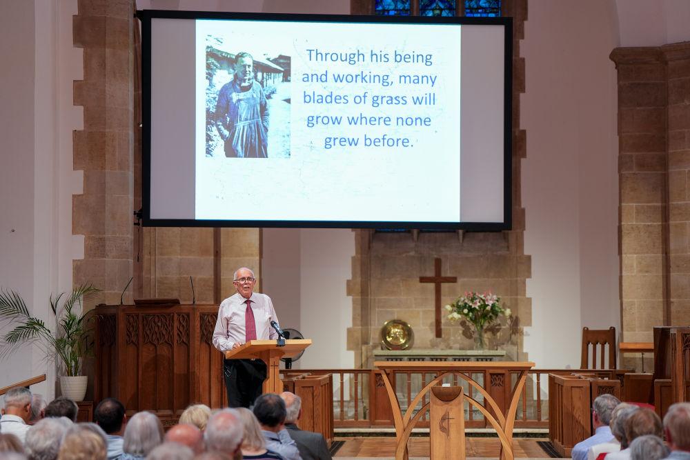 7月22日晚,英國赫特福德郡哈彭登鎮(zhèn),何克逝世80周年紀(jì)念活動現(xiàn)場,座無虛席。屏幕上,一幀幀畫面定格下何克在中國的身影與足跡。講臺上,何克的外甥馬克·艾爾溫·托馬斯深情講述80多年前的往事。