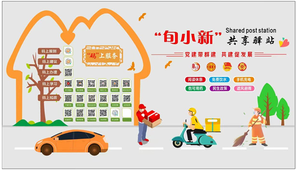 “旬小新”共享驛站按照“黨建帶群建 共建促發(fā)展”思路,秉持“需求前置、服務(wù)賦能”理念,通過整合行業(yè)部門、企業(yè)、社會三方資源,著力構(gòu)建“15分鐘暖新服務(wù)生態(tài)圈”,為快遞員、外賣騎手等新就業(yè)群體提供閱讀休息、免費飲水、手機(jī)充電、應(yīng)急藥箱等18項基礎(chǔ)服務(wù)設(shè)施。