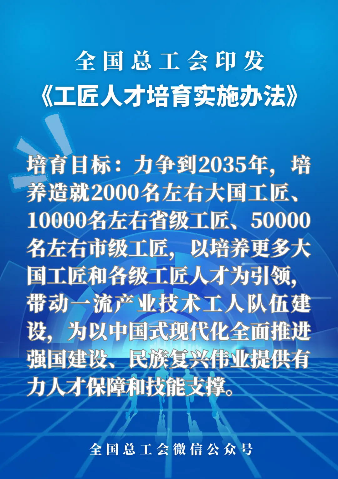 第二條 培育目標是,力爭到2035年,培養(yǎng)造就2000名左右大國工匠、10000名左右省級工匠、50000名左右市級工匠,以培養(yǎng)更多大國工匠和各級工匠人才為引領(lǐng),帶動一流產(chǎn)業(yè)技術(shù)工人隊伍建設(shè),為以中國式現(xiàn)代化全面推進強國建設(shè)、民族復(fù)興偉業(yè)提供有力人才保障和技能支撐。