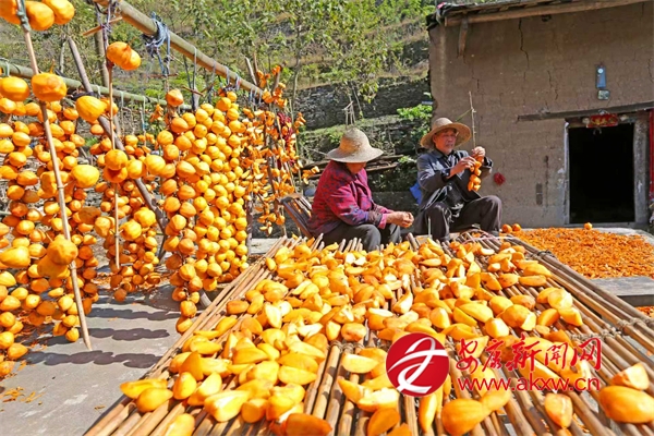鄉(xiāng)親們趁著柿子還沒軟就采摘下來(lái),在房前屋后搭起一排排晾曬柿餅的木架,開始每年一次的傳統(tǒng)手工勞作:去皮、懸掛、晾曬。出霜后就成了美味的柿餅。