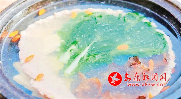 “白火石汆湯是我跟我祖父和父親學的手藝,13歲開始學做廚,白火石汆湯里面主要用到新鮮的豬肉,加蔥姜、蛋清、鹽、雞精以及料酒、生粉、蛋清,將其剁成肉泥,貼到陶盆里面,上厚下薄,里面陸續(xù)放上木耳、小青菜、豆腐,然后把石頭燒紅之后放進陶盆內的紗布中,只消幾分鐘,一道美味可口的白火石汆湯便做好了。”解遠平一邊準備食材,一邊向筆者介紹著白火石汆湯的做法。