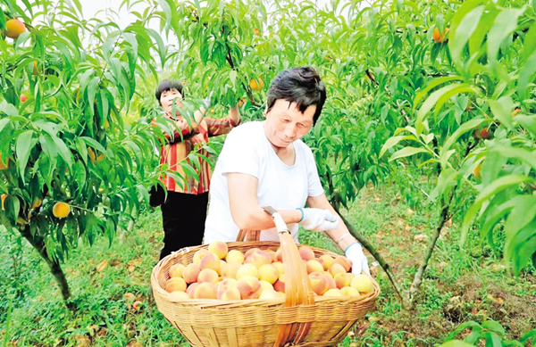 “這個桃子好甜噢,你也來嘗嘗!”桃園里呼朋喚友的聲音此起彼伏,游客們暢游其中享受著采摘的樂趣。